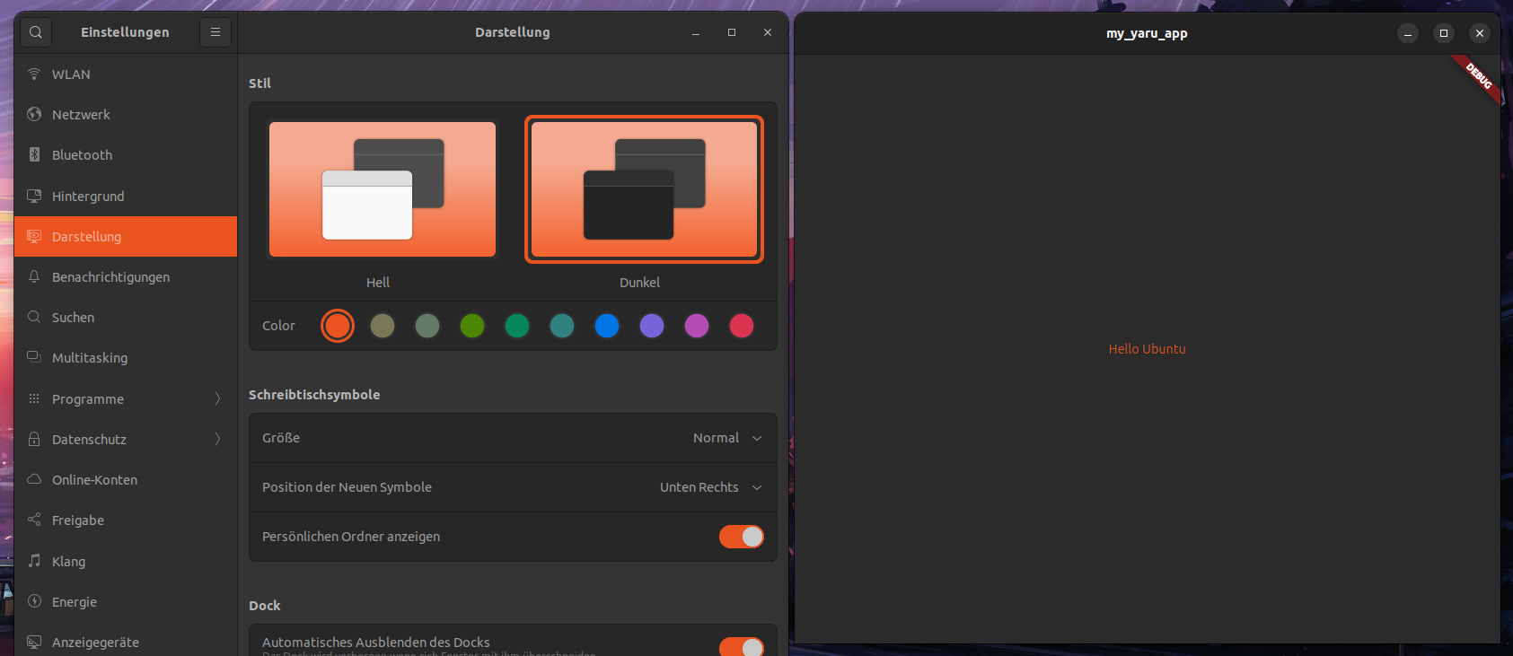 yarucan now be used as a parameter ofMaterialApp, and the flutter app will switch it's accent colors according to what accent color is selected in your Ubuntu settings app. -