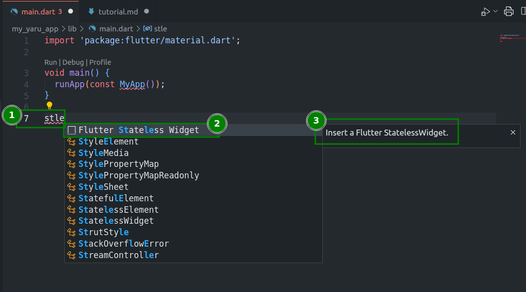 The first help we will use is the snippet stle which is short for StatelessWidget.