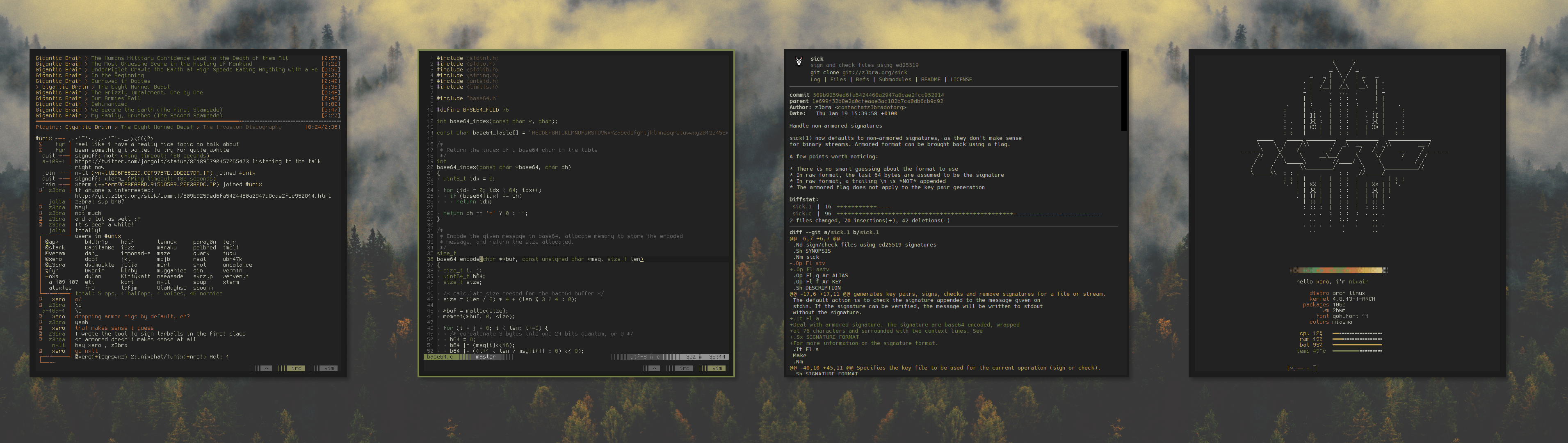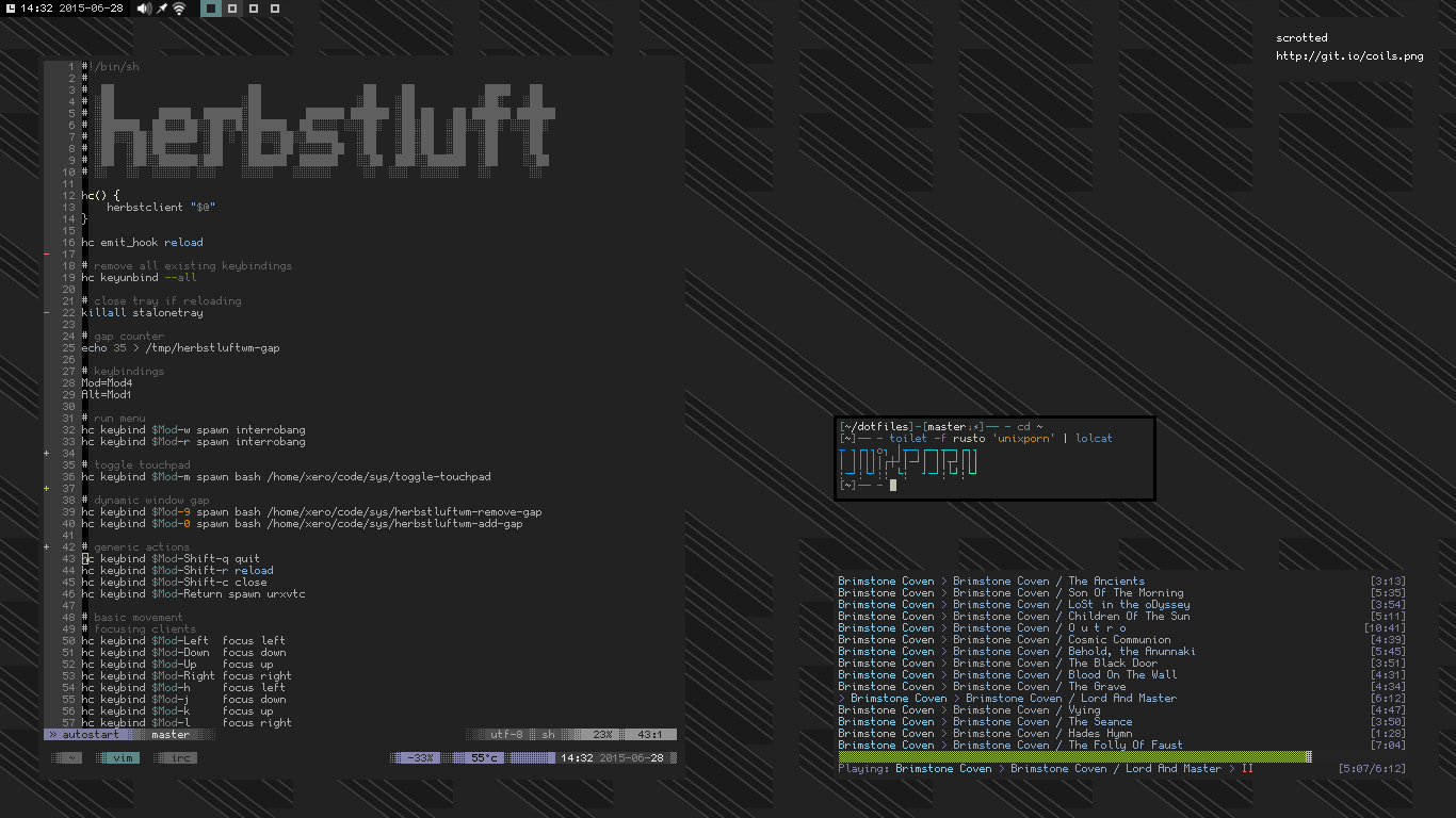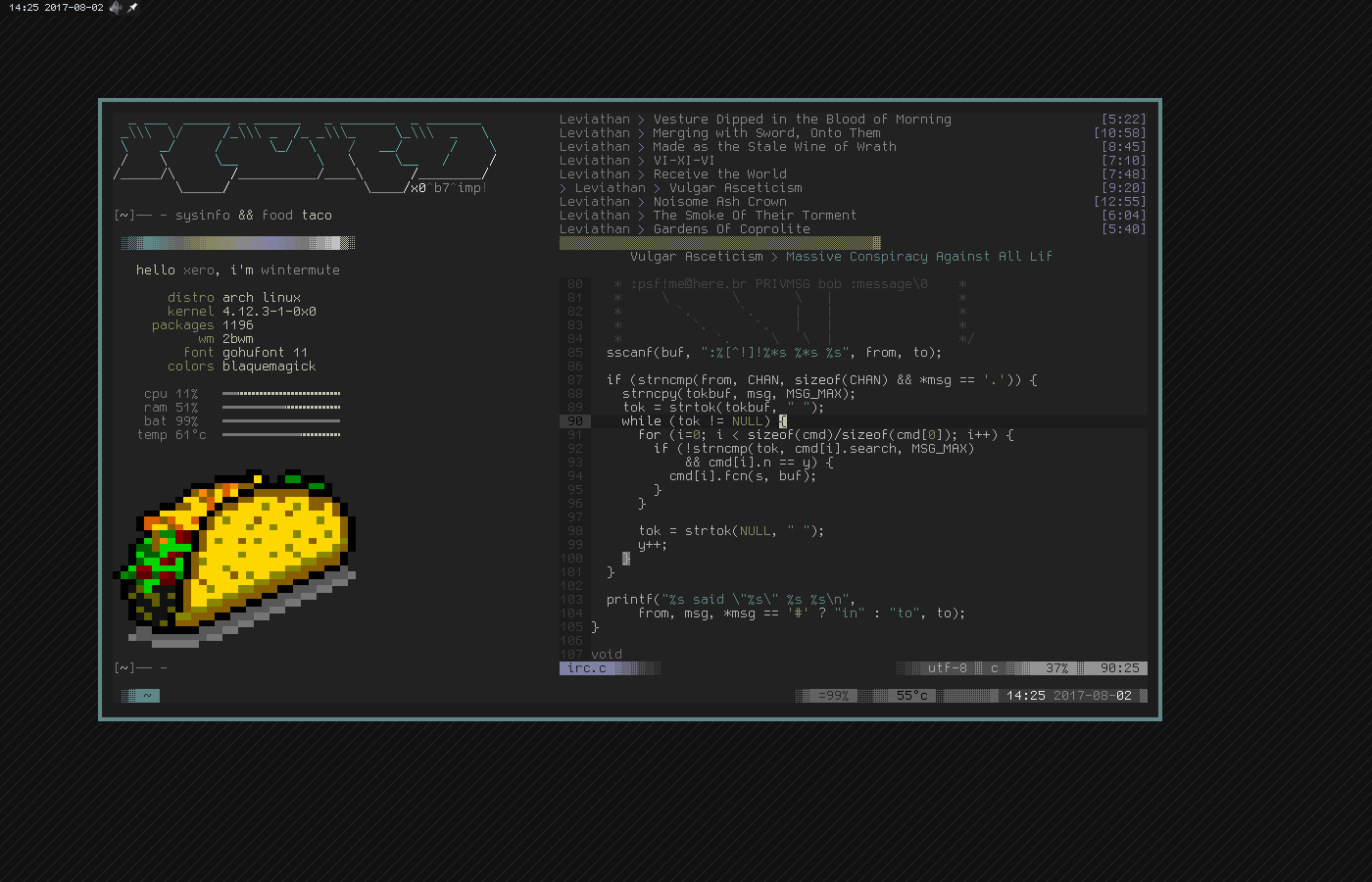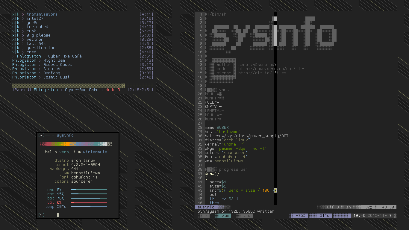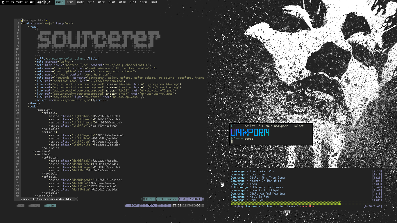 my terminal emulator of choice is the lightweight, unicode, 256 color urxvt. i use zsh as my interactive shell. it's an extensible, bash like shell with awesome completion and correction engines. i manage multiple shell sessions with tmux. it's a feature packed terminal multiplexer with support for buffers, split windows, detached local and remote sessions, etc. i'm a member of the cult of vim. sing phrases to the third reincarnation of the glorious ed! lel. mpd is my music server and i use ncmpcpp as it's frontend. my configs for urxvt, zsh, tmux, vim, mpd and ncmpcpp shown above feature my sourcerer color scheme.