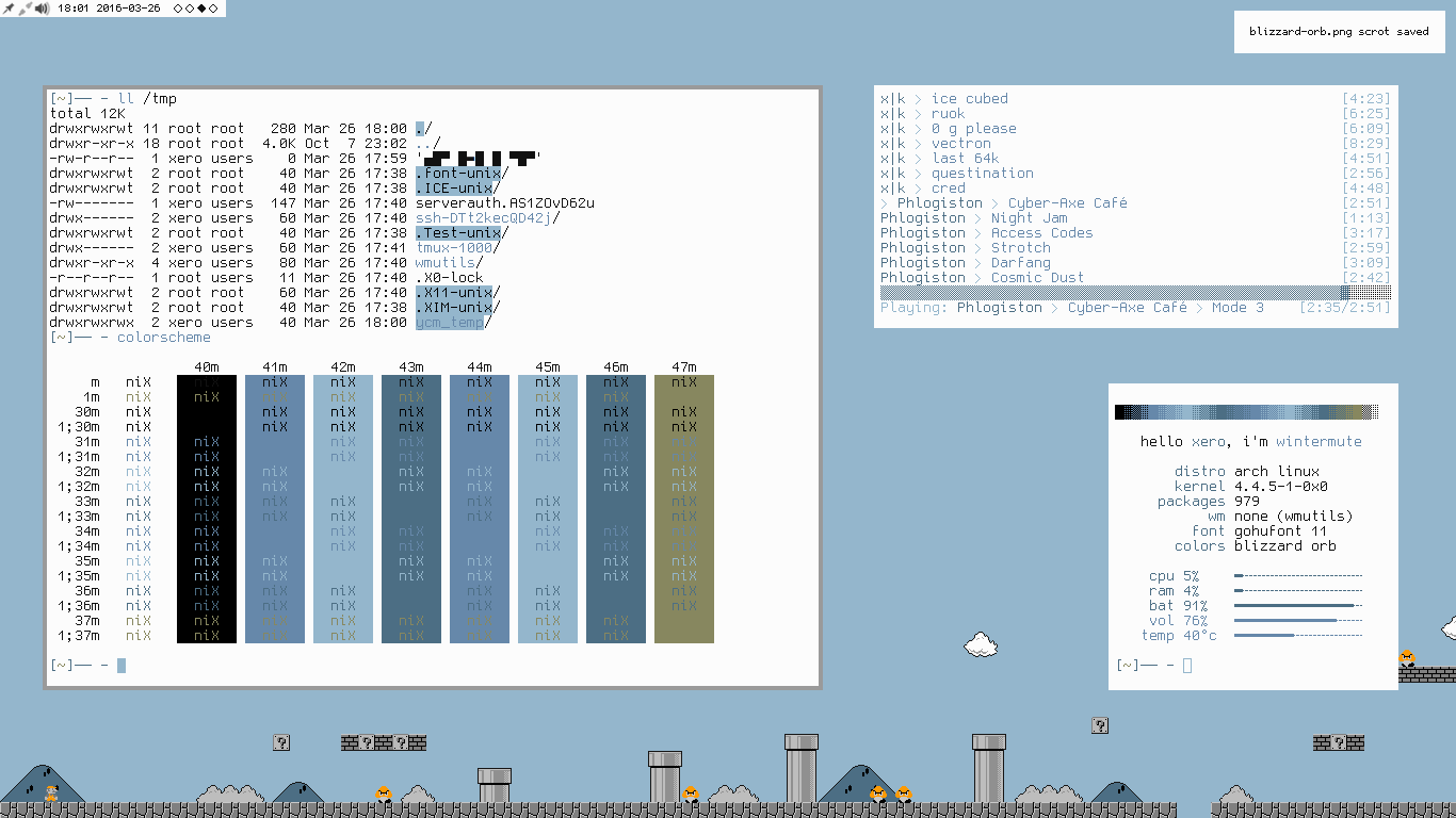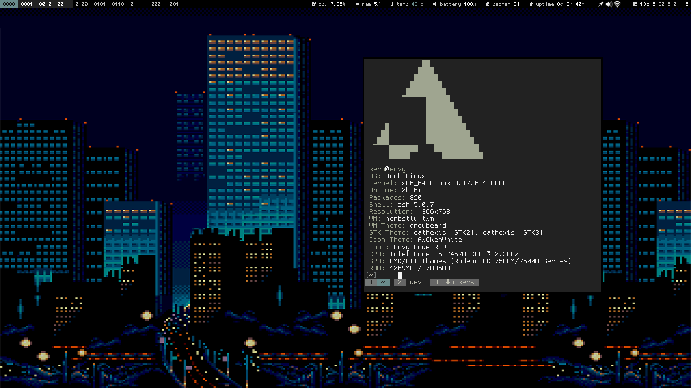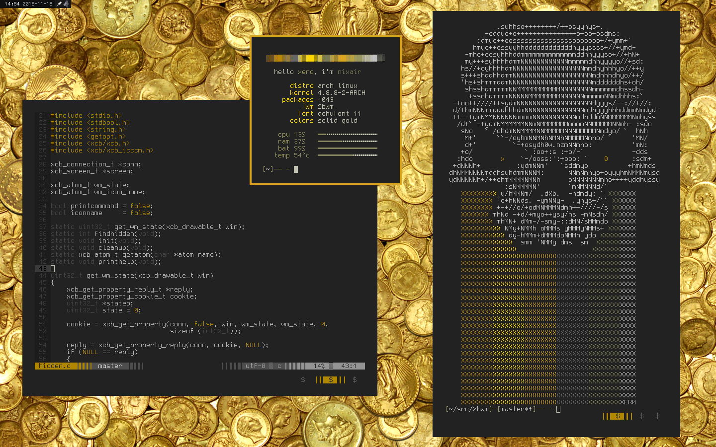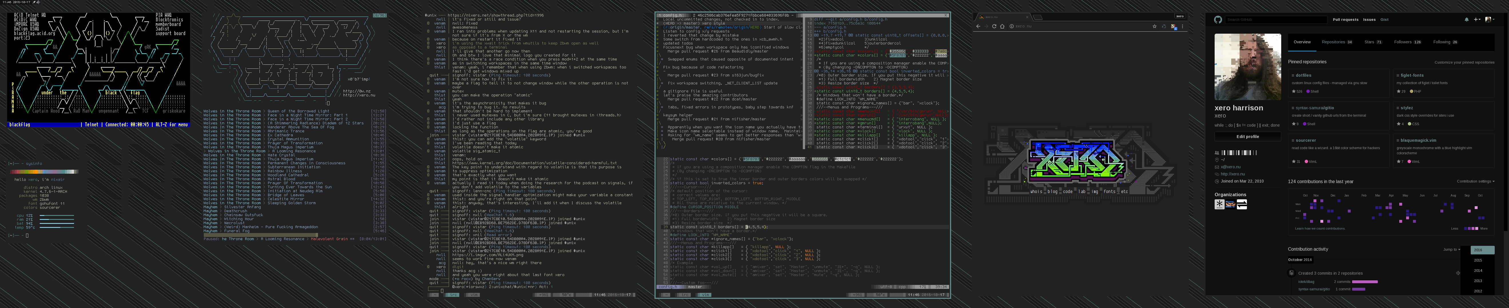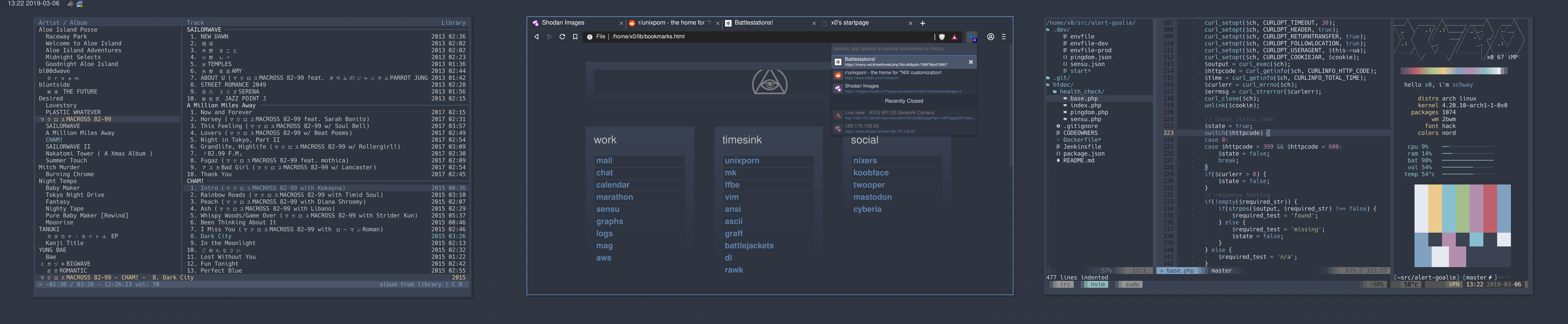 my terminal emulator of choice is the lightweight, unicode, 256 color urxvt. i use zsh as my interactive shell. it's an extensible, bash like shell with awesome completion and correction engines. i manage multiple shell sessions with tmux. it's a feature packed terminal multiplexer with support for buffers, split windows, detached local and remote sessions, etc. i'm a member of the cult of vim. sing phrases to the third reincarnation of the glorious ed! lel. mpd is my music server and i use ncmpcpp as it's frontend. my configs for urxvt, zsh, tmux, vim, mpd and ncmpcpp shown above feature my sourcerer color scheme.
