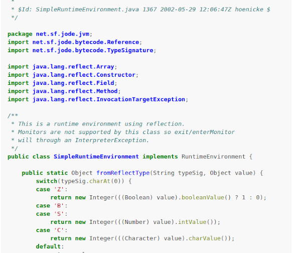 This SimpleRuntimeEnvironment class is used by JODE to deobfuscate strings by dynamically executing some of the bytecode. This code in particular attempts to handle method invocation in static constructors.