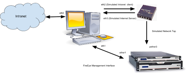 This allows access to the FireEye device via the management interface, and to generate simulated traffic across the network tap from the same machine.