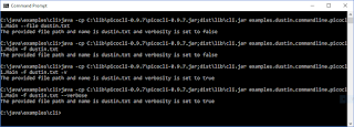CommandLine.javasource code file (Picocli 0.9.7) is just under 3700 lines (including white space and comments) and is almost 200 KB in size. Thepicocli-0.9.7.jarfile is approximately 83 KB in size. - Picocli enjoys current and frequent support. Its 0.9.8 version was released yesterday (after I had written most of this post).