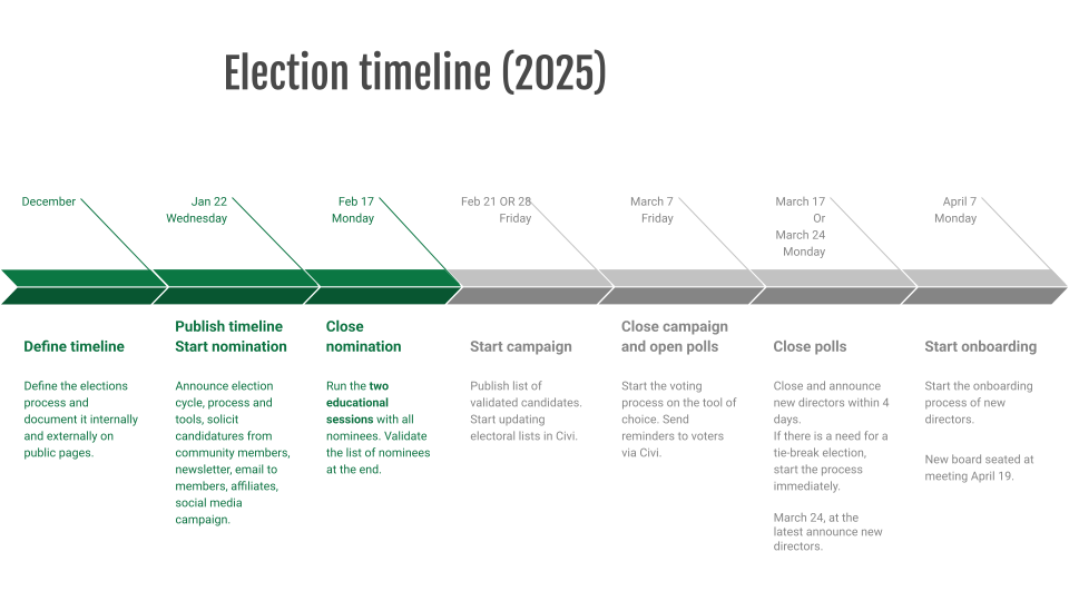 The Board will vote on any changes to be made to the election rules no later than the January meeting, and ideally in the December meeting. OSI staff will then post a list of dates and deadlines, as well as any election rule changes, for the upcoming election.