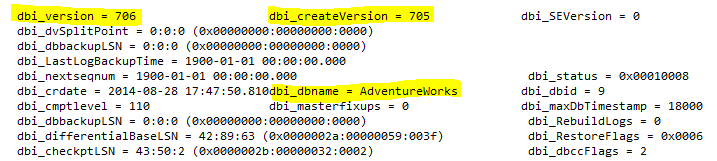 In the above example, you can see that I’m looking at the AdventureWorks database, the database version is currently set at ‘706’ and it was created with version ‘705’. This tells me that the database was initially created on a SQL Server 2012 instance (possibly a CTP version) and then subsequently upgraded when restored to my test SQL Server 2012 SP2 instance.