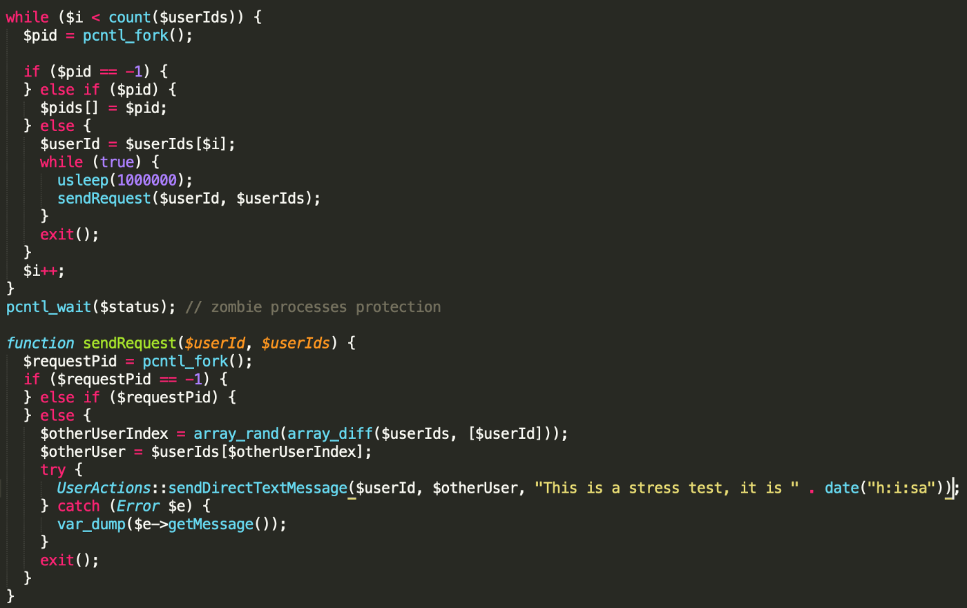 The simplest form of this is to fork one process per user, and then fire requests for each of those users in a rhythmical fashion (of course there are tools for this). This gives us the ability to tweak how many users are in our stress testing environment and how much traffic they are producing on our servers. And that was the cherry on top, seeing the whole system work as expected after all the effort put into it.