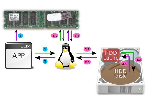 3. ...the kernel did NOT find the requested data in the page-cache. "Sigh!" it says and starts its bike and begins it journey all the way to HDD-land. On its way, the kernel decides to call-up its old friend "HDD-cache" and tells him that he will be arriving shortly to collect a package of data from HDD-land. HDD-cache, the good-friend as always, tells the kernel not to worry and that everything will be ready by the time he arrives in HDD-land.