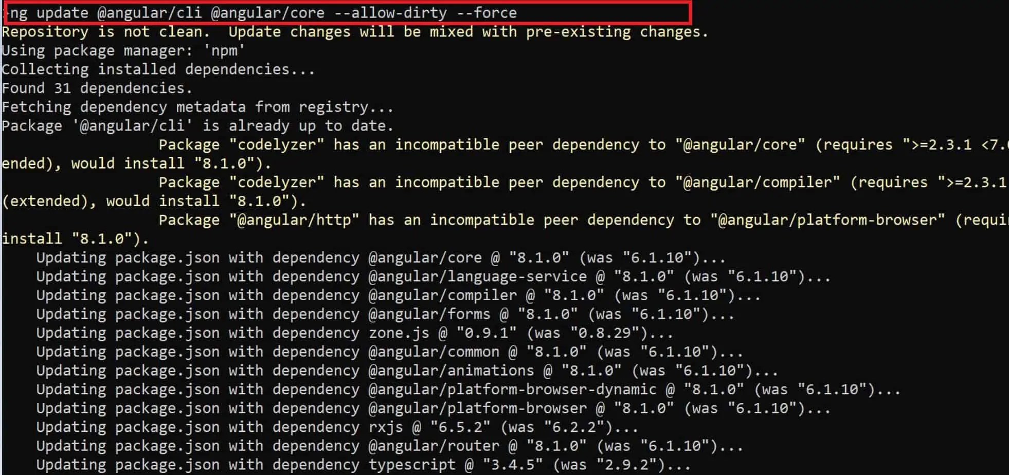 - Run ng update command to get a list of all dependencies required to be upgraded.