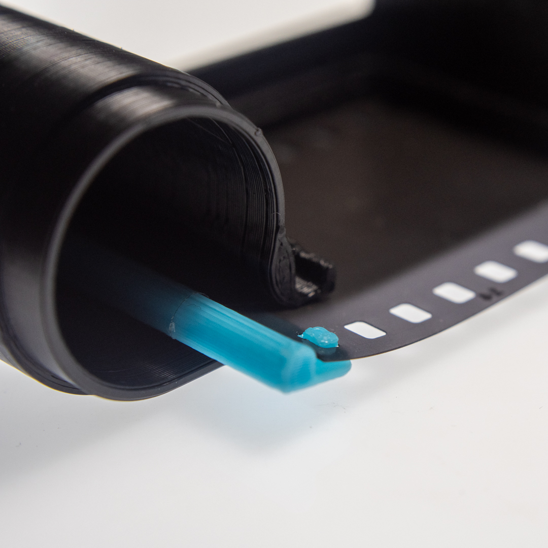 - Take a 35mm film, cut it straight at the end and tape it to the take-up spool.